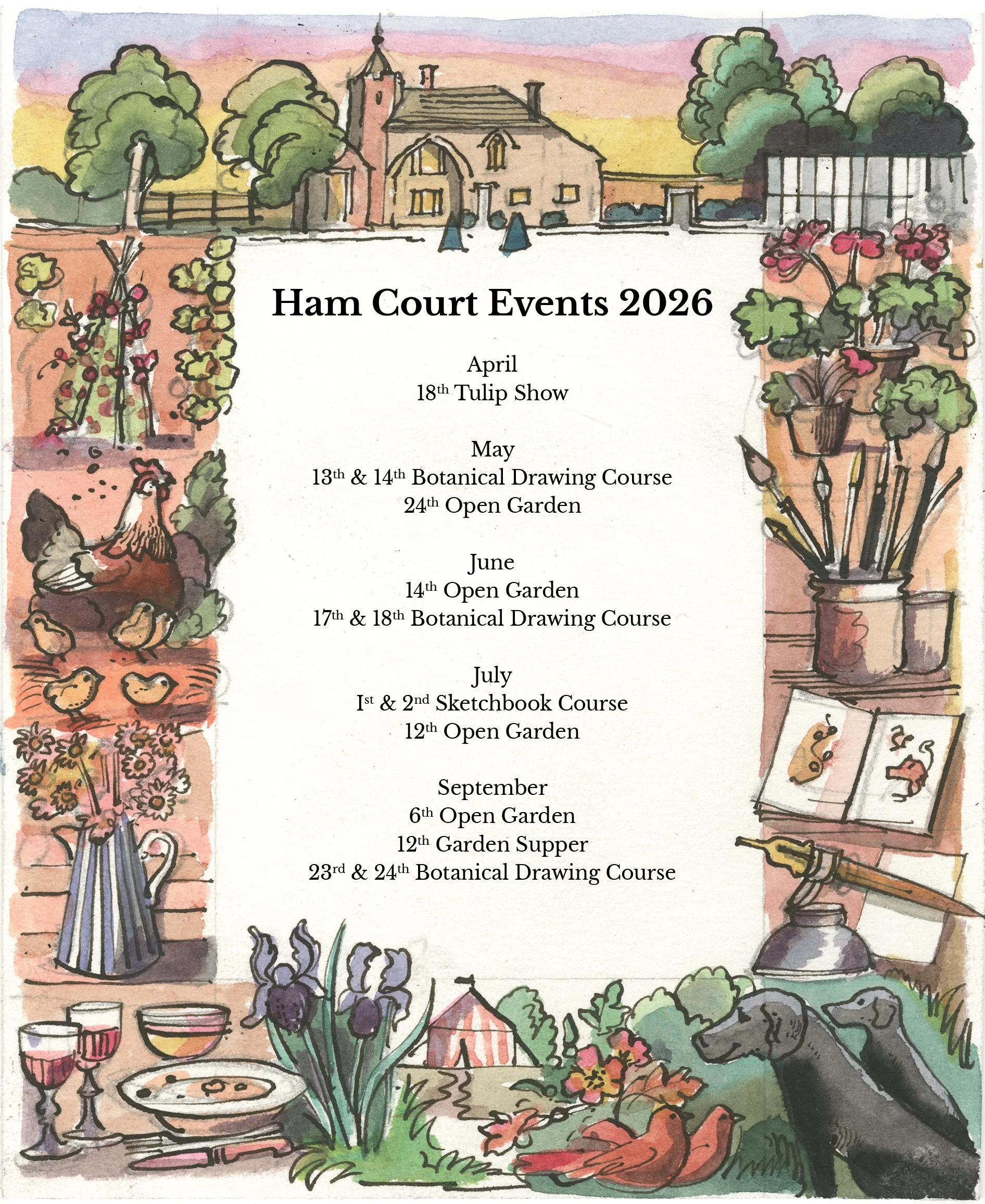 We are very excited to welcome you to Ham Court. Come and visit the garden during our Open Garden days, book a watercolour course or join us for supper at one of our Private View & Supper evenings.